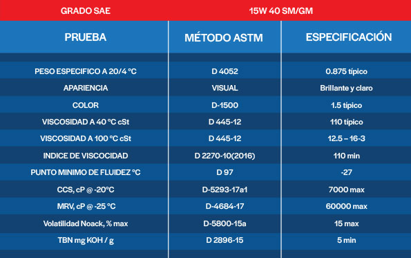 • Cumple especificaciones astm d- 3306 (servicio a equipos a gasolina).